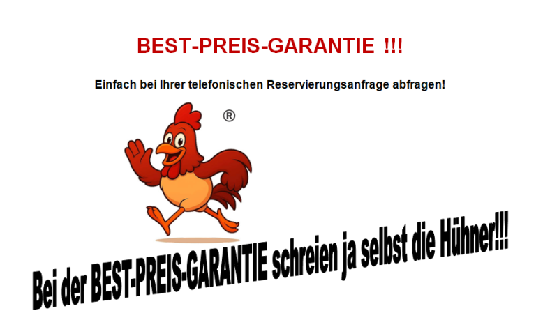 (Zeigen Sie uns ein verbindliches Angebot einer anderen Transportervermietung, Umzugsservices oder Entrümpelungsservices, mit den selben Parametern und ChickenCar®-Rent liegt preislich garantiert unter diesem Angebot. [Es gibt keine Verpflichtung für uns, auf ein günstigeres Angebot, gegenüber Ihrer Anfrage])